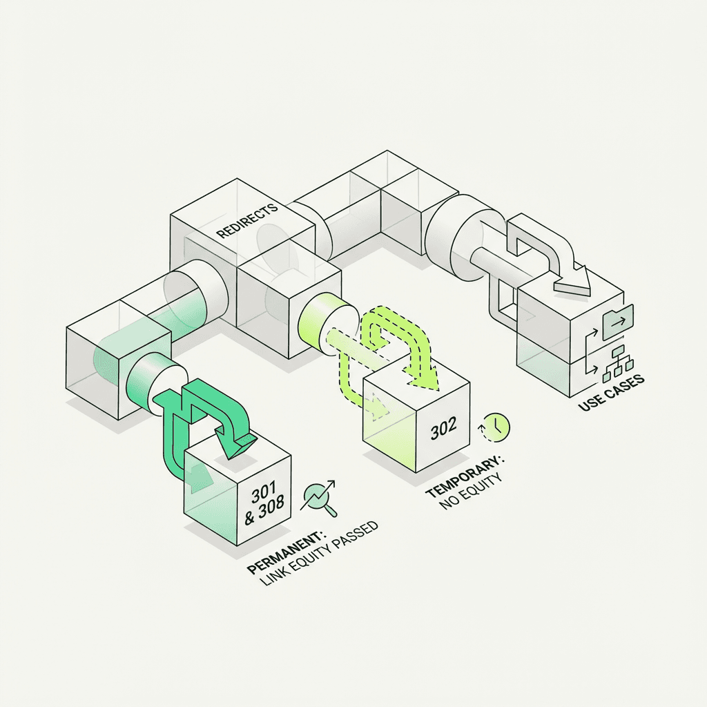 301 vs 302: Use 301 for permanent moves, 302 for temporary redirects. When in doubt, choose 301 to preserve SEO signals.