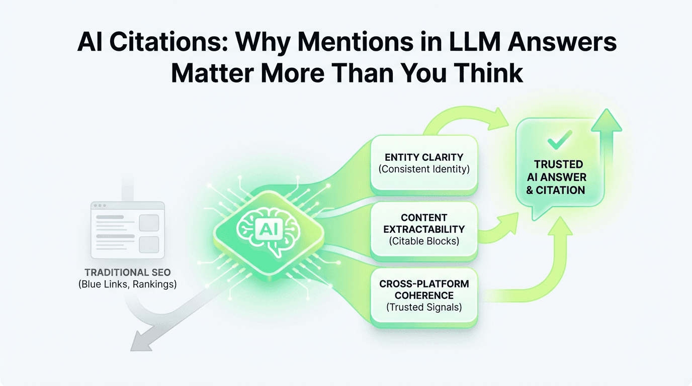 LLMs cite sources based on three signals: Entity clarity, content extractability, and cross-platform coherence (the core of ai search seo answer engine optimization (AEO)).