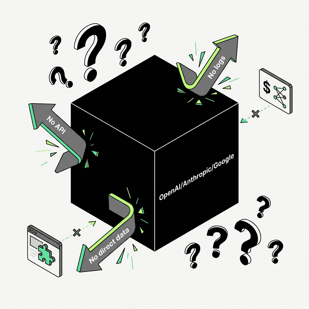 OpenAI doesn't publish prompt logs. Neither does Anthropic, Google (for Gemini), or Perplexity. There is no API equivalent to Google Ads Keyword Planner. Zero first-party data access.