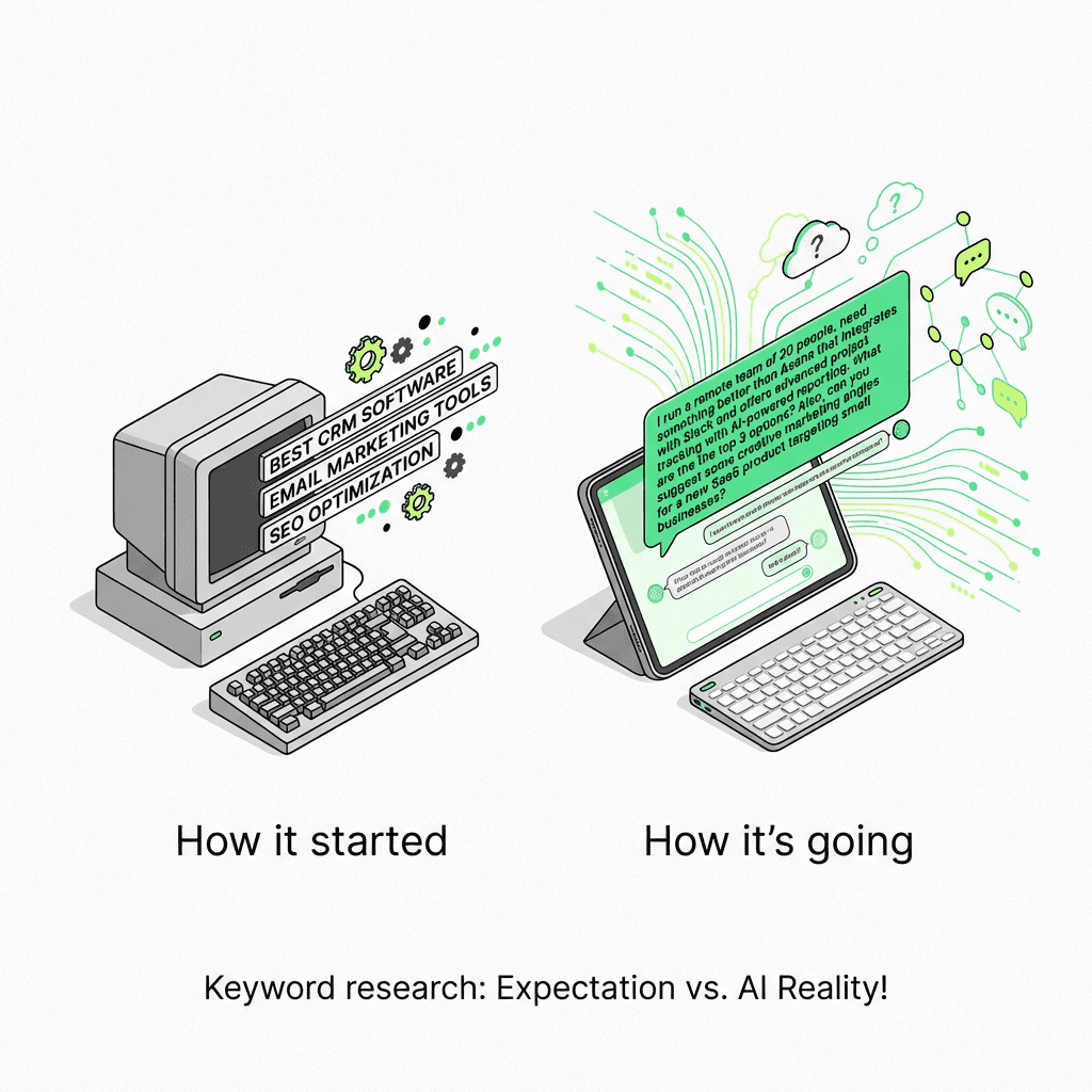 Traditional search queries average 3-4 words. They're standardized, keyword-centric, and aggregatable. "Best project management software" is functionally identical whether searched by a startup founder or an enterprise IT director.