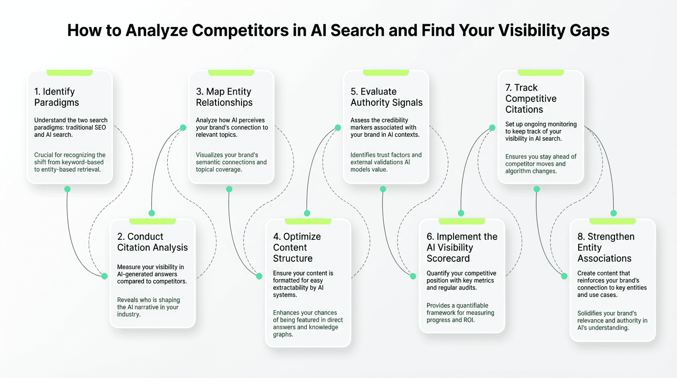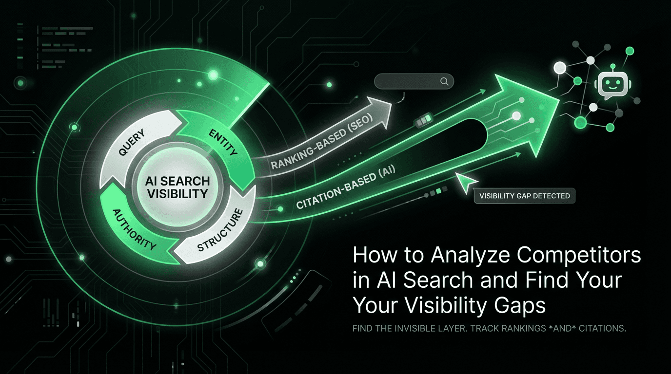 Competitor analysis in AI search measures which brands and sources get cited or mentioned inside AI-generated answers (e.g., ChatGPT, Perplexity, Claude, Google AI Overviews), not just who ranks in blue links. It focuses on citation share, mention order, and whether AI systems associate competitors with key entities (use cases, features, categories). This reveals "visibility gaps" that traditional SEO tools often miss.