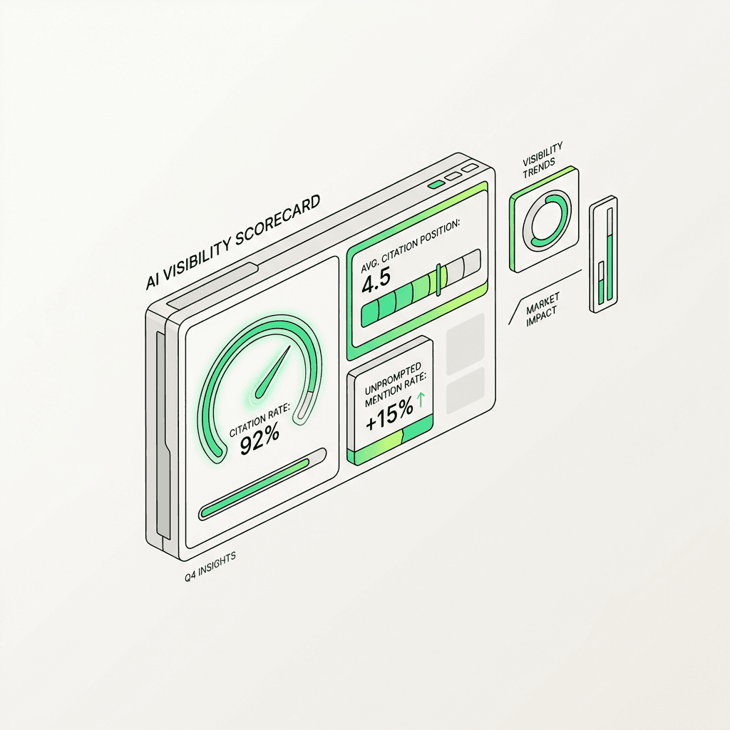 Quantify with the AI Visibility Scorecard: Track citation rate, average citation position, unprompted mention rate, entity association strength, and source recommendation rate.