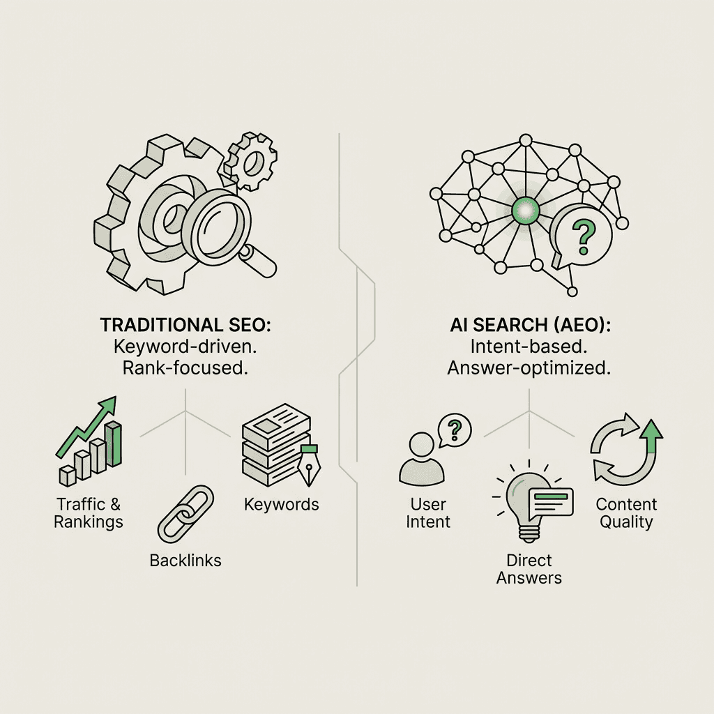 SEO optimizes for position in search results; AEO (Answer Engine Optimization) optimizes for inclusion and attribution inside AI answers. Rankings are about index + retrieval + SERP placement; citations are about whether an AI system can retrieve, trust, and cleanly quote/summarize your page. Most teams need both because buyers often move from AI answers to targeted vendor research.