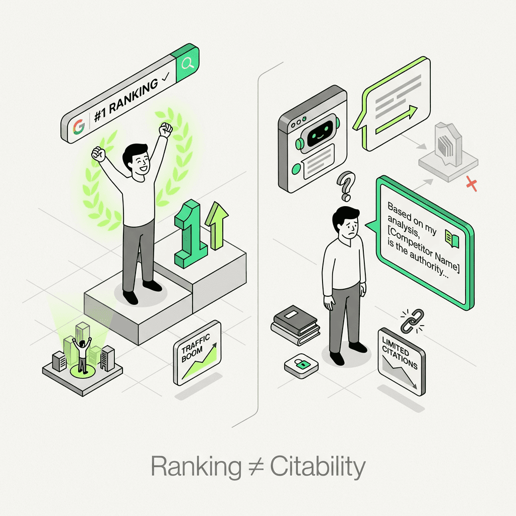 When I started asking prospects how they researched solutions, the answer was consistent: "I asked ChatGPT for a comparison, then dug into the tools it mentioned." We weren't in those comparisons. We had won the ranking war but lost the citation war. That's when I understood: we were optimizing for a paradigm that was rapidly becoming secondary.