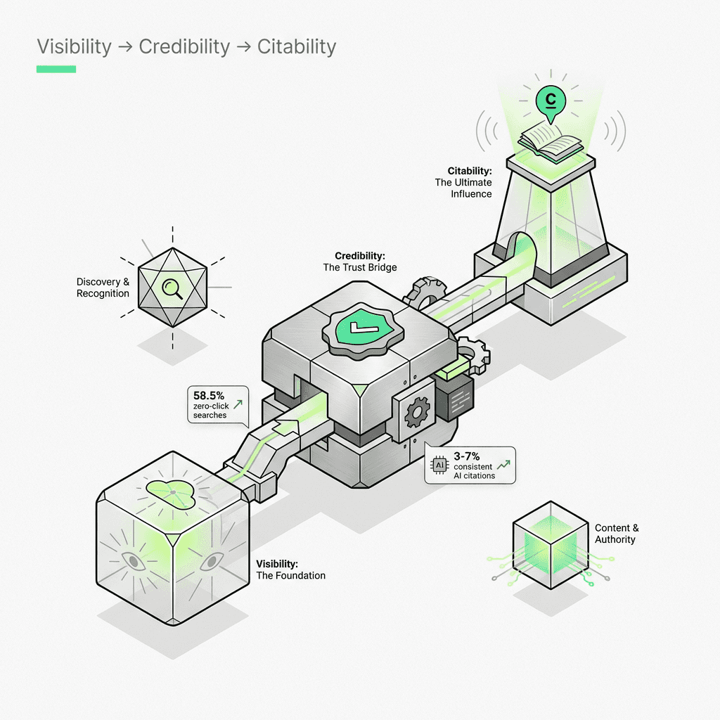 The framework: Visibility → Credibility → Citability—you must be found, trusted, and structured for synthesis