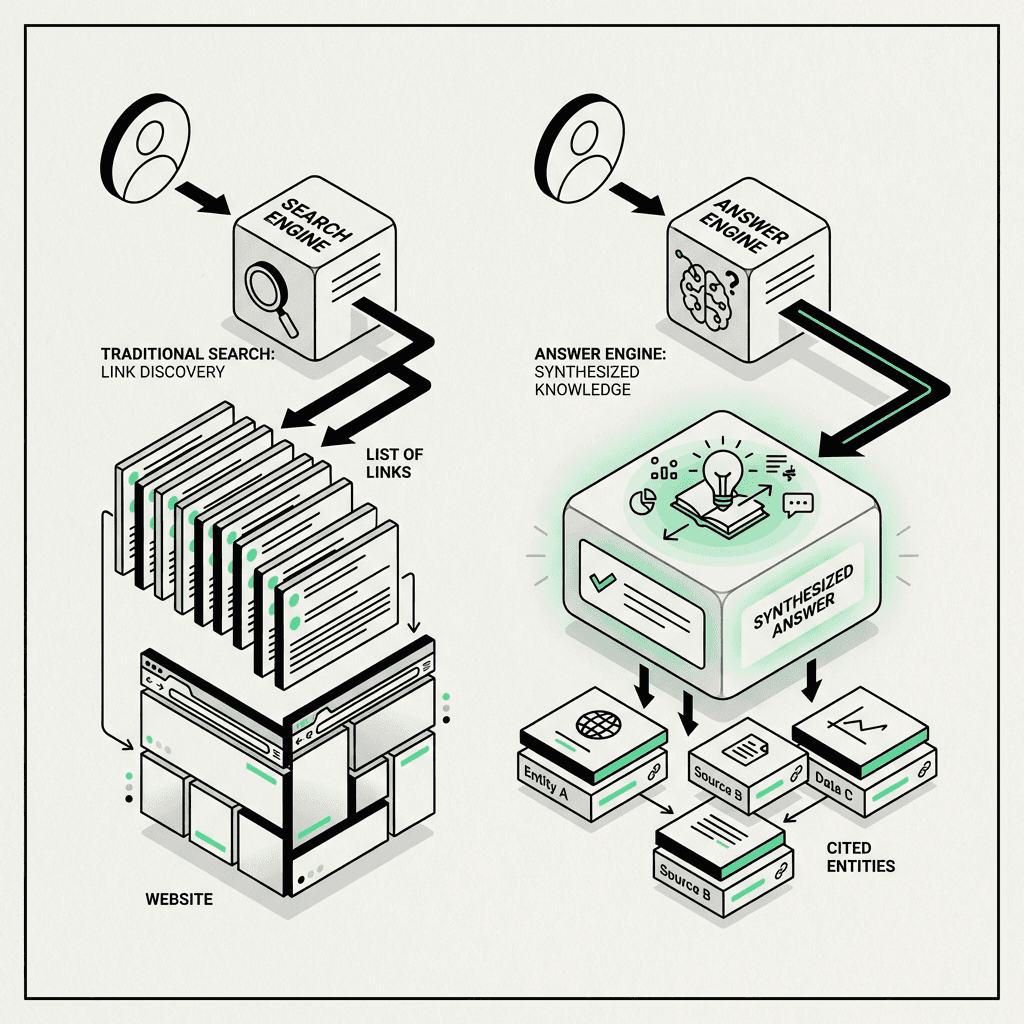 Answer engines (ChatGPT, Perplexity, Gemini) synthesize answers from multiple sources, not just links