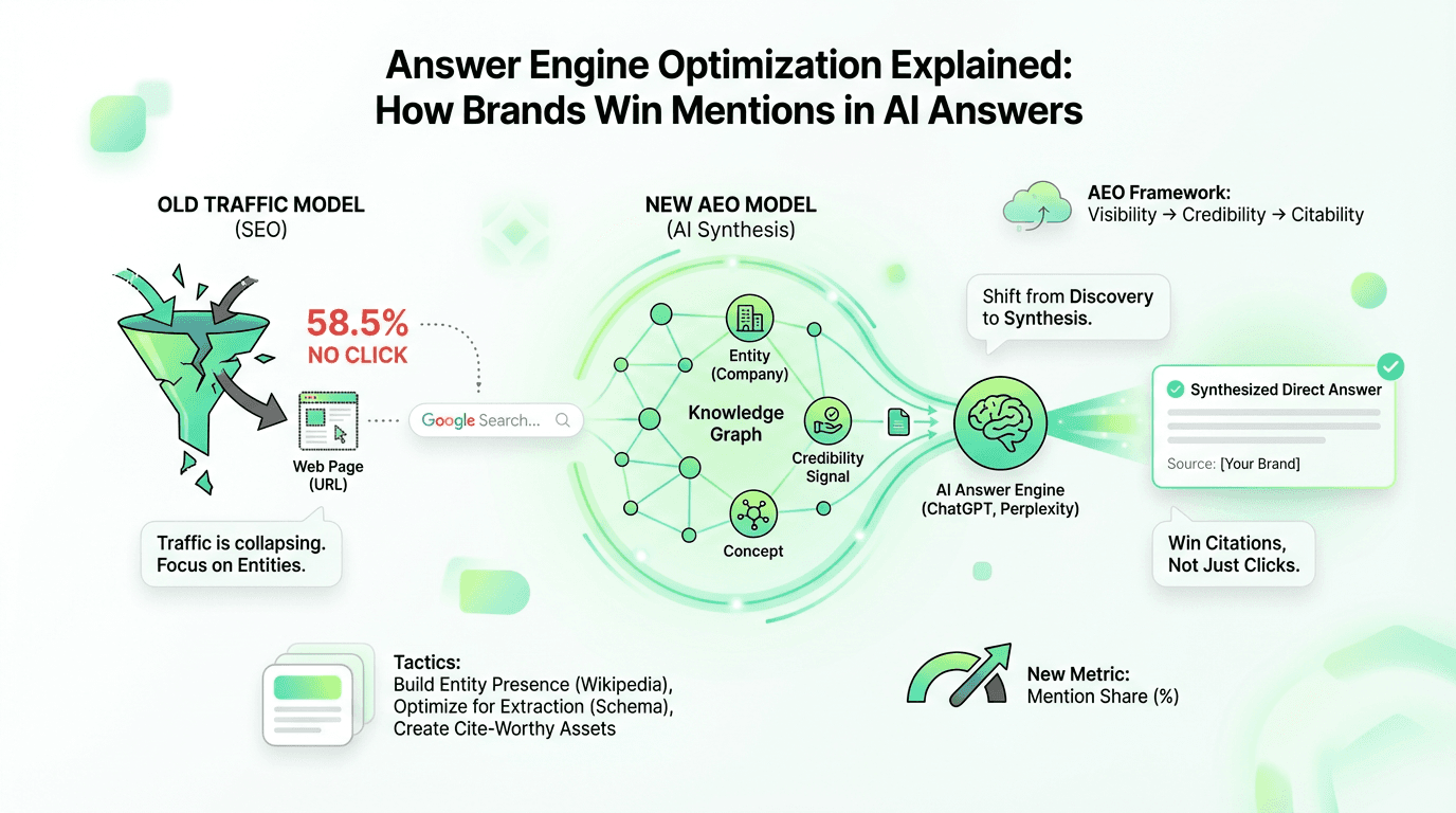 Traditional SEO measures traffic. Answer engine optimization measures mention share.