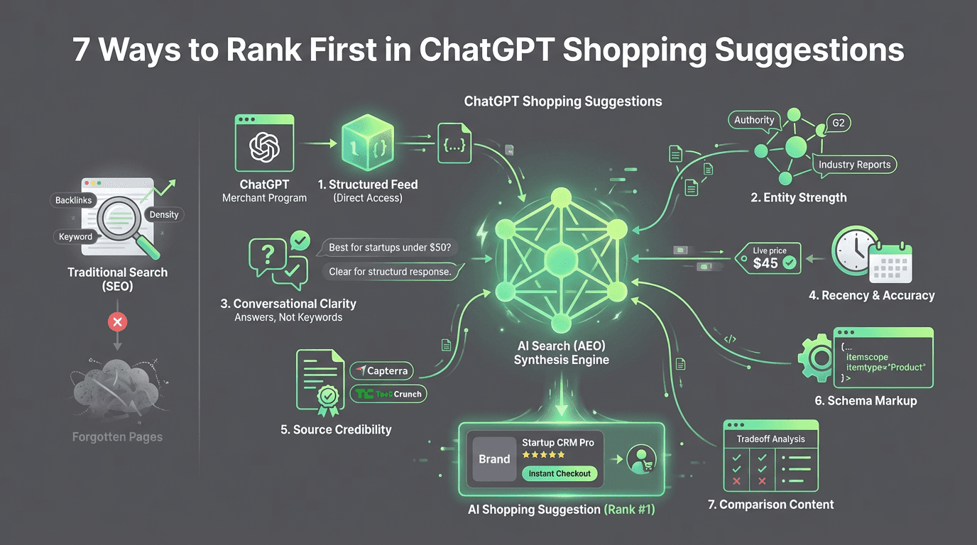 Backlinks and keyword density are not the primary drivers because ChatGPT Shopping isn't selecting results from a ranked list of pages the way Google does. What matters more is entity strength (being consistently associated with your category and use cases) and structured data that reduces ambiguity. Traditional SEO still supports crawlability and discoverability, but it's rarely sufficient on its own for ChatGPT shopping suggestions.