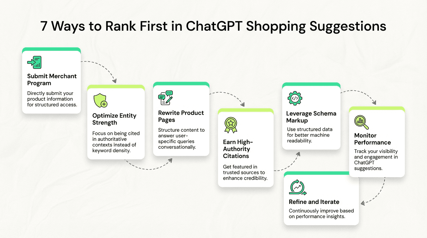 Strategy #1 Summary: Submit structured feeds via chatgpt.com/merchants. Include: specifications, current pricing, use case associations, and customer ratings. This creates a primary data layer ChatGPT prioritizes over scraped content.