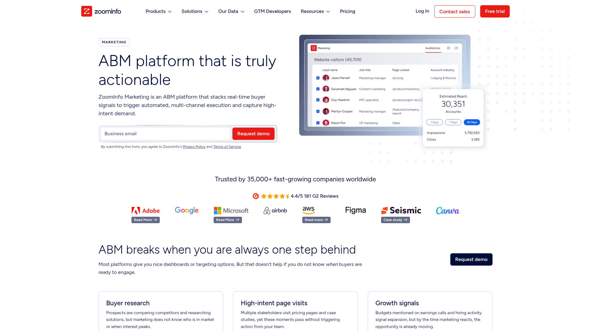 Strengths: ZoomInfo's industry-leading b2b contact data and real-time buyer intent signals drive accurate account targeting and fast list creation. Users on G2 note its ability to streamline account based marketing workflow and reduce manual data handling. The platform's campaign orchestration capabilities allow for truly connected multi-channel outreach.