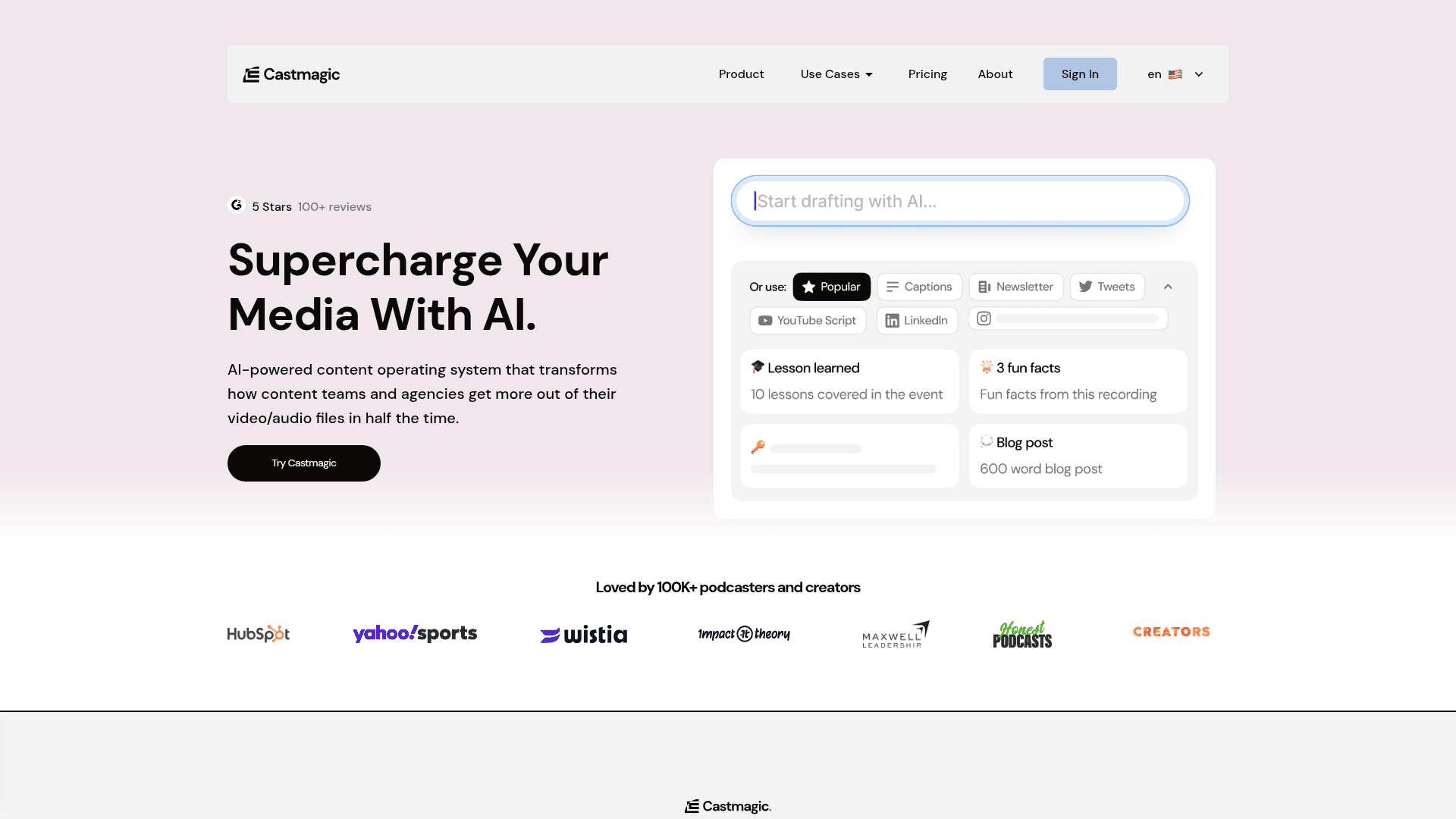 Castmagic and Descript are leading options for repurposing audio content. Castmagic converts podcasts and calls into transcripts, social posts, and summaries, while Descript offers text-based audio editing, AI transcription, and multi-channel asset generation.
