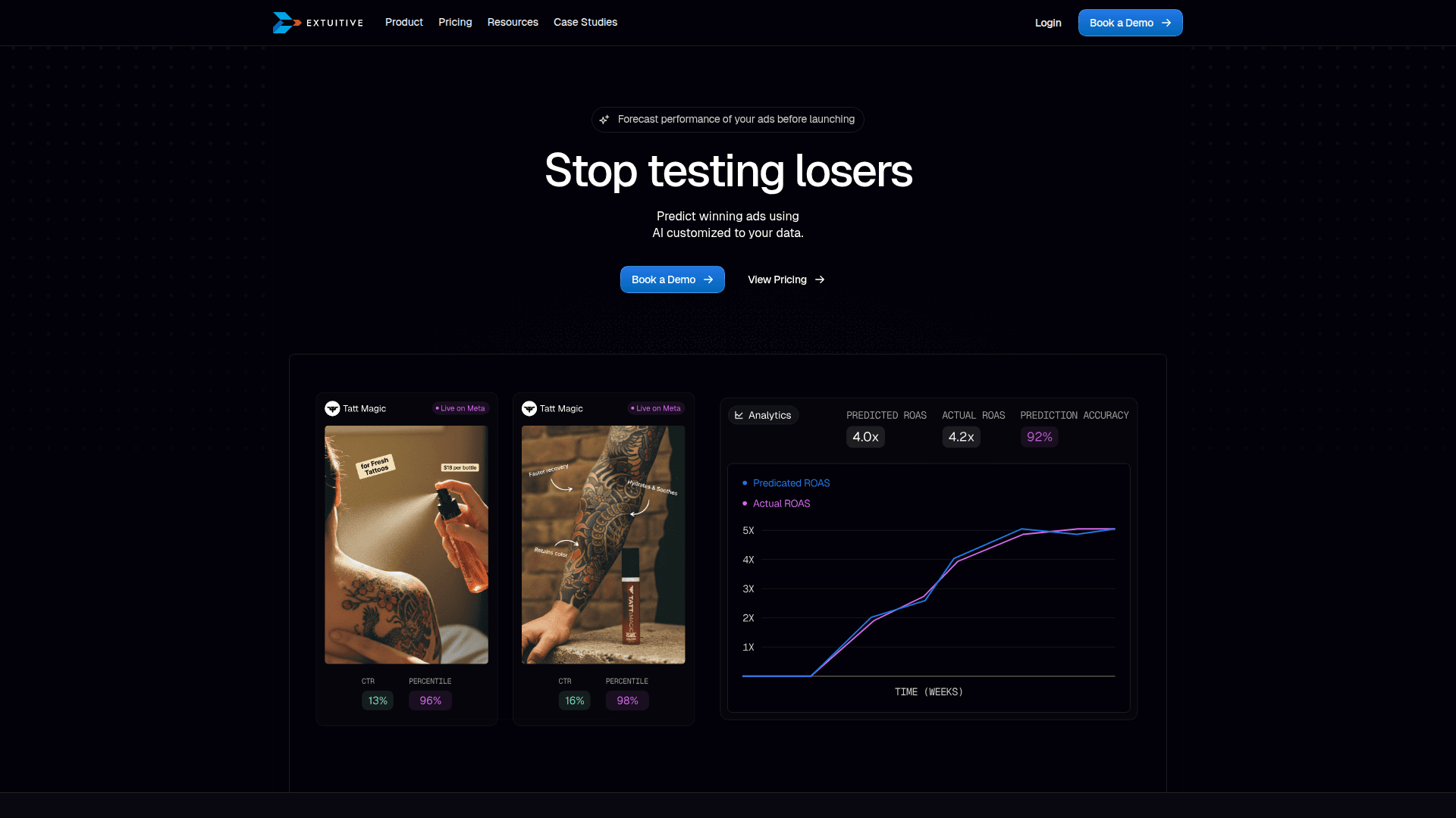 Extuitive specializes in pre-launch ad creative testing for B2B SaaS, using your historical Meta and Instagram ad data to predict CTR and ROAS. It helps teams forecast performance, flag weak creatives, and optimize assets before spending budget on live campaigns. The platform is ideal for marketing teams managing multiple ad accounts who need data-driven insights to improve campaign efficiency and maximize ROAS.
