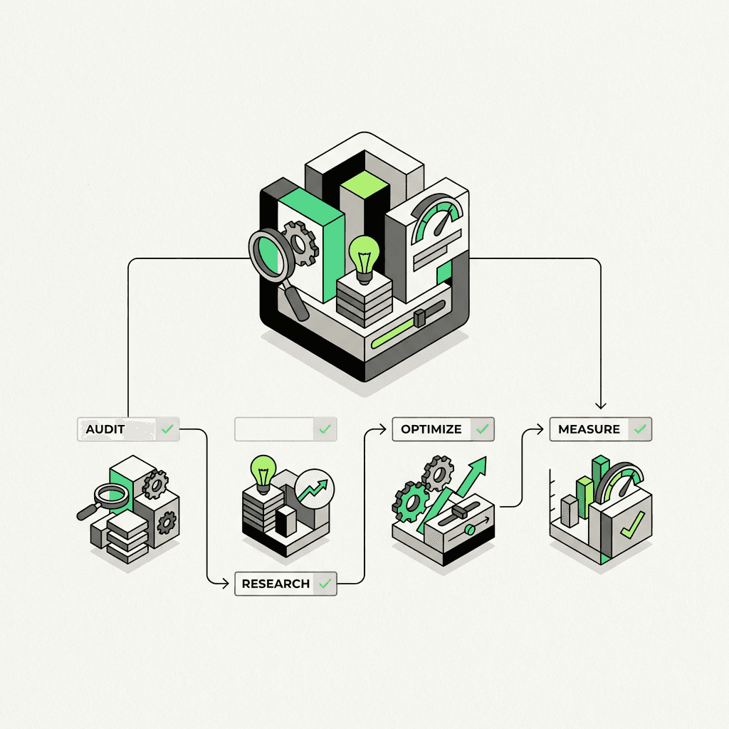 Visibility without optimization is just expensive reporting. Here's how to fix what's broken through technical audits and competitive analysis.