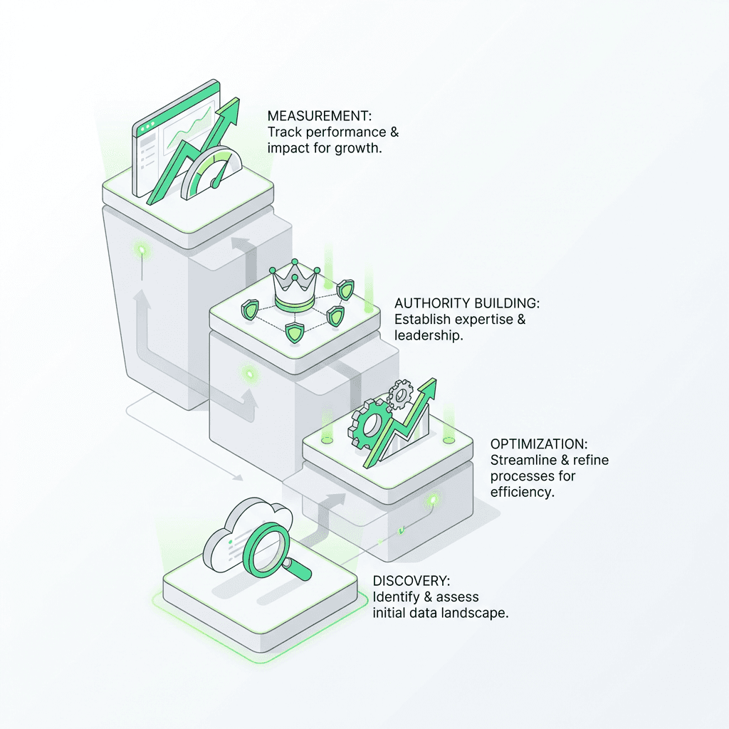 Stage 1: Discovery — Understand where you currently stand in AI search with visibility tracking Stage 2: Optimization — Fix technical and content gaps preventing citation through data analysis Stage 3: Authority Building — Become the definitive source AI models trust through semantic optimization Stage 4: Measurement — Track citations, sentiment, competitive positioning, and revenue impact with performance tracking
