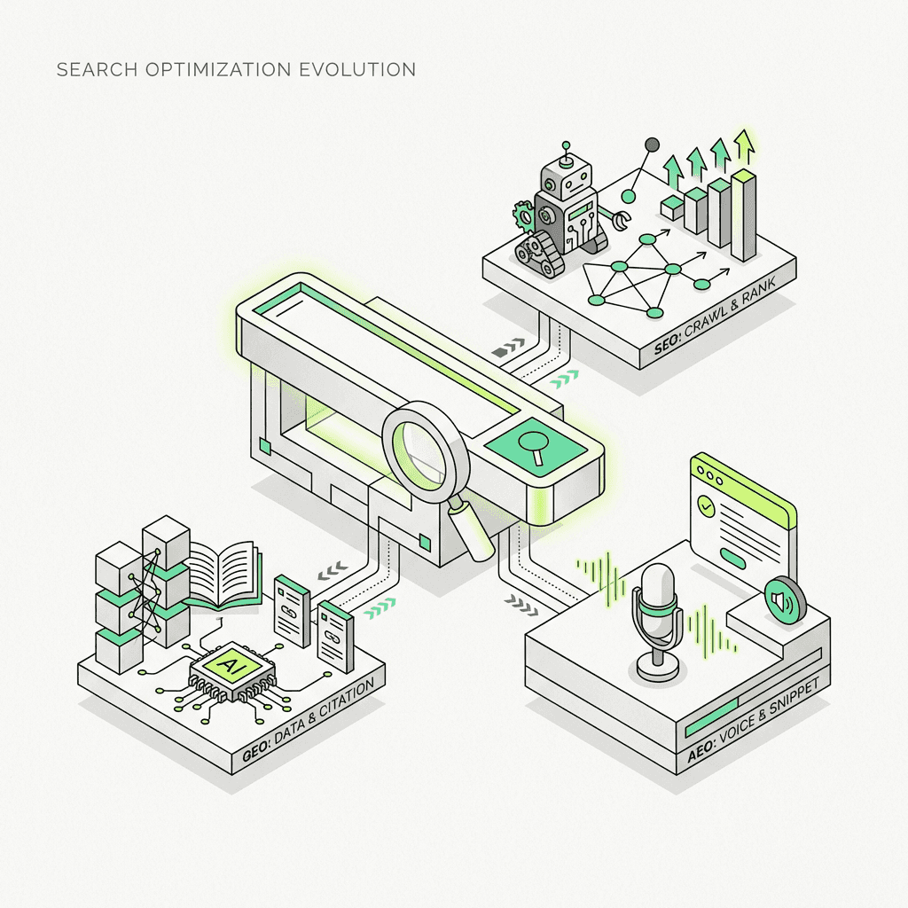 SEO optimizes for crawler-based rankings, while AEO optimizes for direct answers like featured snippets and voice results. GEO optimizes for being cited in AI-generated answers by strengthening training-data-aligned signals such as entity consistency, semantic depth, and structured data integrity across your site.