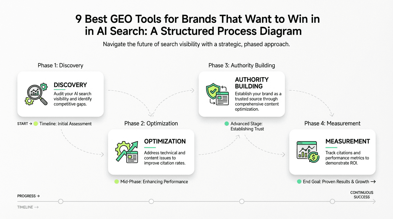 9 tools across 4 stages: Discovery (citation tracking, question research) → Optimization (technical audits, competitive analysis, gap identification) → Authority Building (semantic optimization, content strategy, topic intelligence) → Measurement (performance tracking, attribution, reporting)