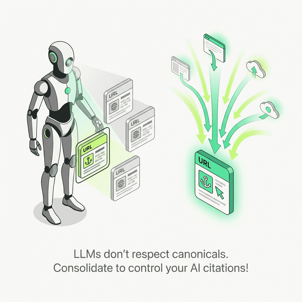 LLMs don't respect canonical tags—duplicate content now risks AI citation dilution, making aggressive consolidation and robots txt blocking more important for AI search optimization