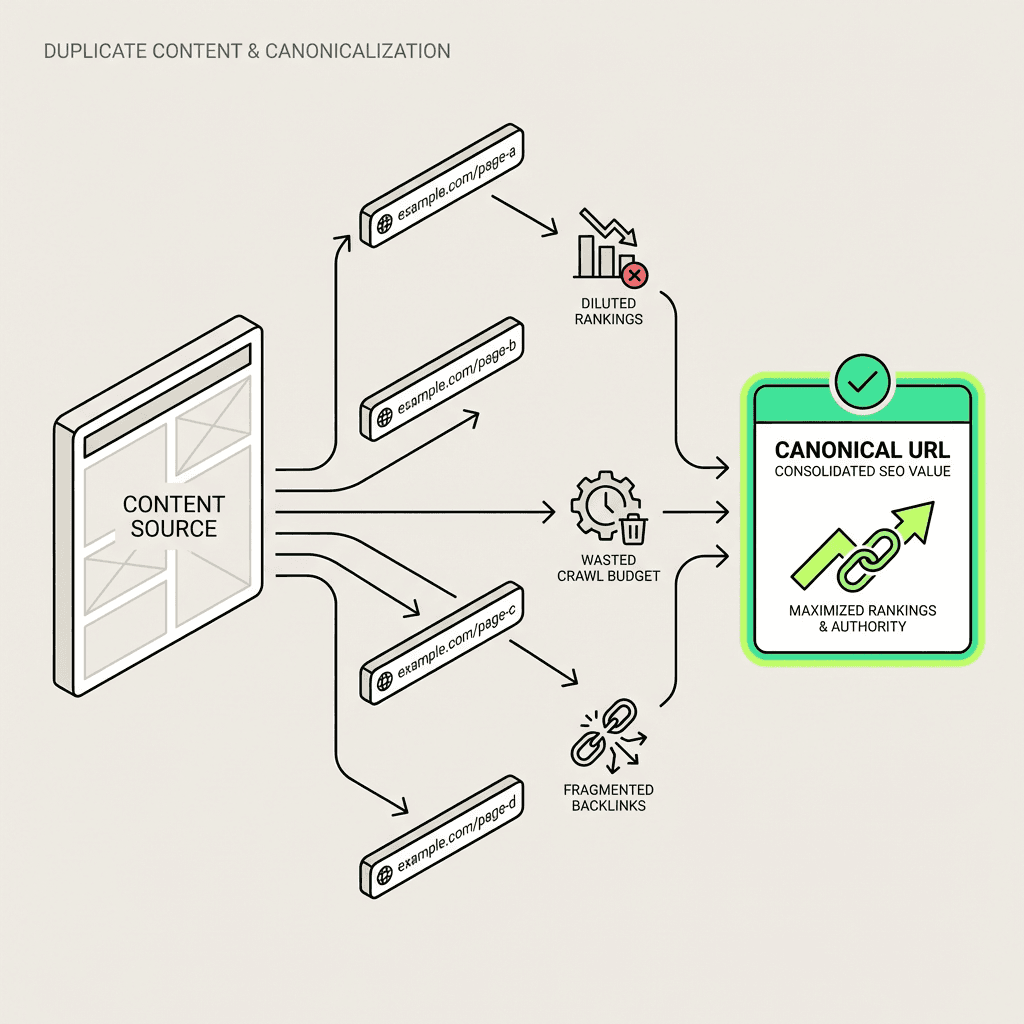 Duplicate content is more common than you think. E-commerce sites generate variants through filters and sorting. Blogs create printer-friendly versions. Marketing campaigns append tracking parameters. Without proper canonicalization, you risk: