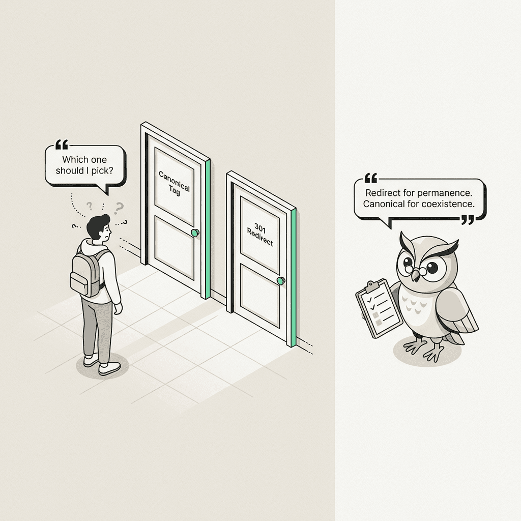Canonical vs. 301: Use canonical tags when users need access to duplicates; use 301 redirects when permanently consolidating or moving pages