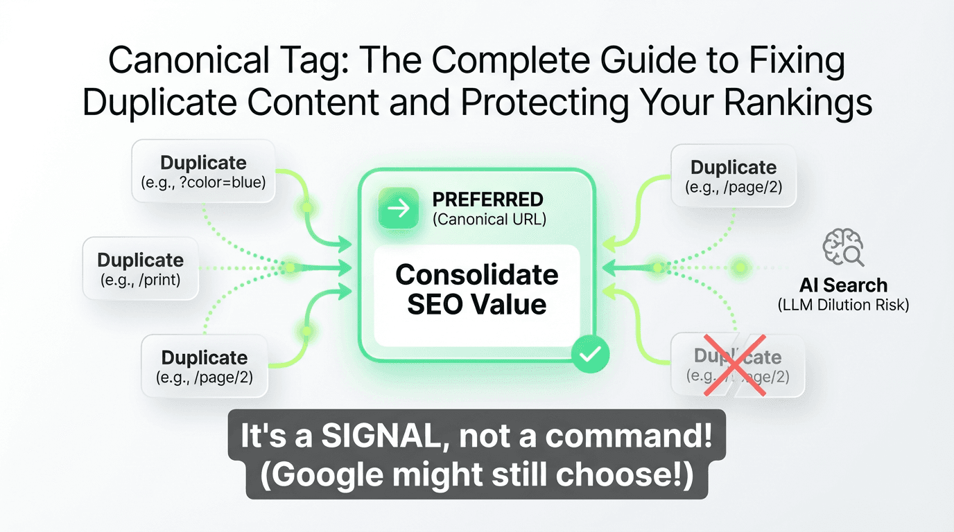 In this guide, we'll walk through everything you need to know about canonical tags in SEO—from implementation and common mistakes to advanced diagnostics and how AI is changing the duplicate content landscape. Whether you're dealing with self-referencing canonical tags, choosing between a canonical vs 301 redirect, or trying to optimize for AI search, this is your definitive resource.