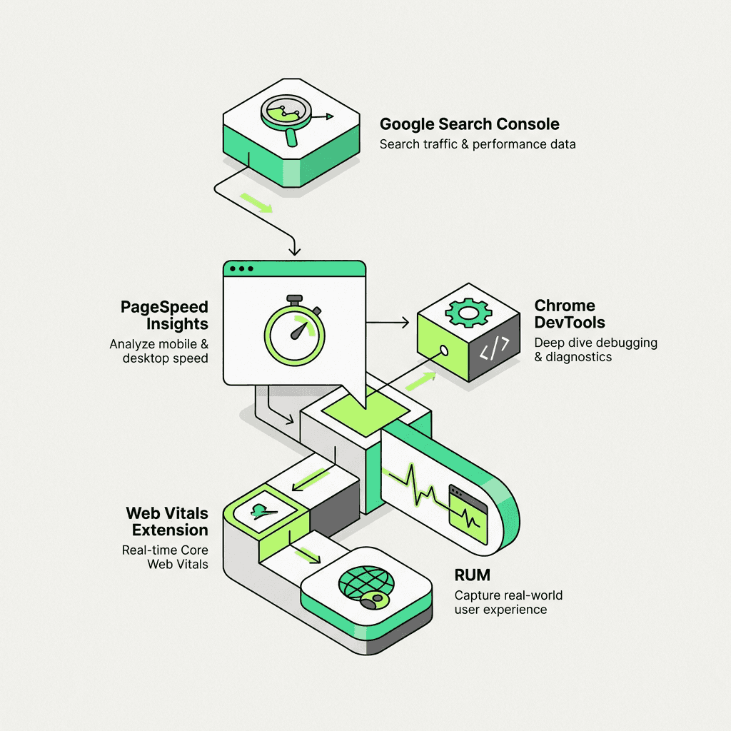 Combine Search Console (field trends and URL groups) with a recurring Lighthouse/PageSpeed Insights process for debugging regressions. For continuous visibility, add Real User Monitoring (RUM) to track LCP/INP/CLS by device, page type, and geography, and set alerts when metrics degrade. This prevents "performance drift" as new scripts, tags, or features get released.