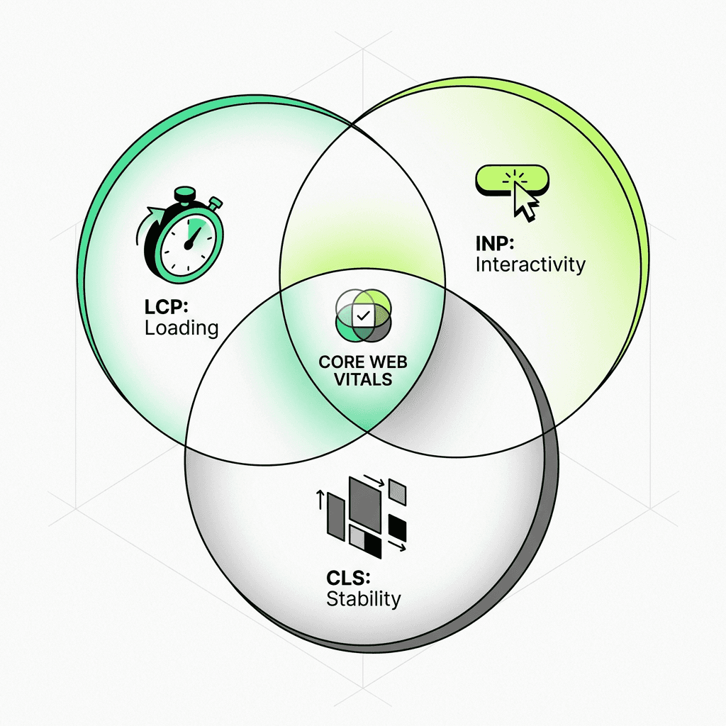 Core Web Vitals are Google's user-experience metrics used in page experience signals to evaluate loading speed, responsiveness, and visual stability. They matter for SEO because they can influence rankings when competing pages have similar relevance and authority. Google's current Core Web Vitals are LCP, INP (which replaced FID), and CLS.