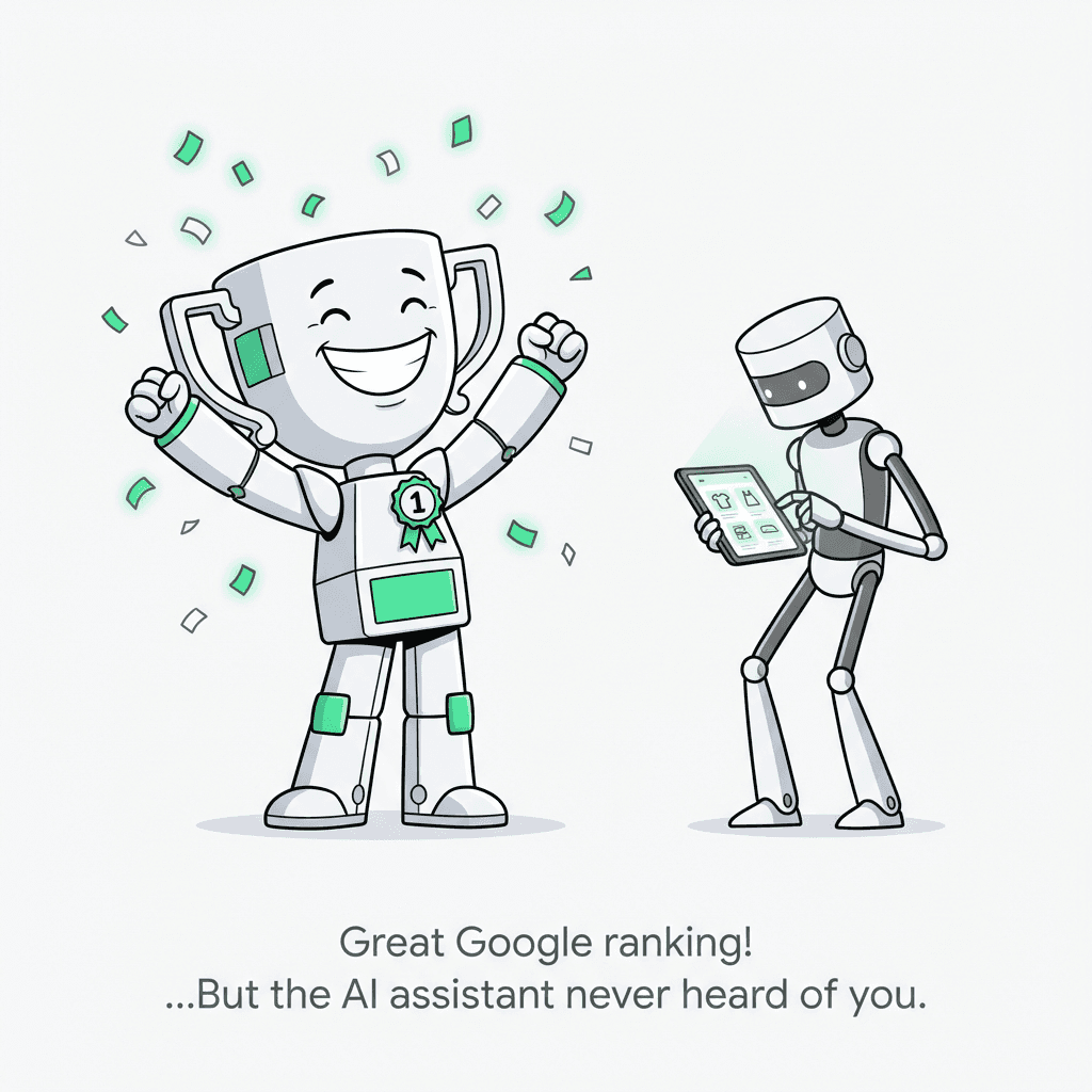 The insight hit hard. We were optimizing for positions in a ranked list while our competitors were training algorithms to default to their store when synthesizing answers.