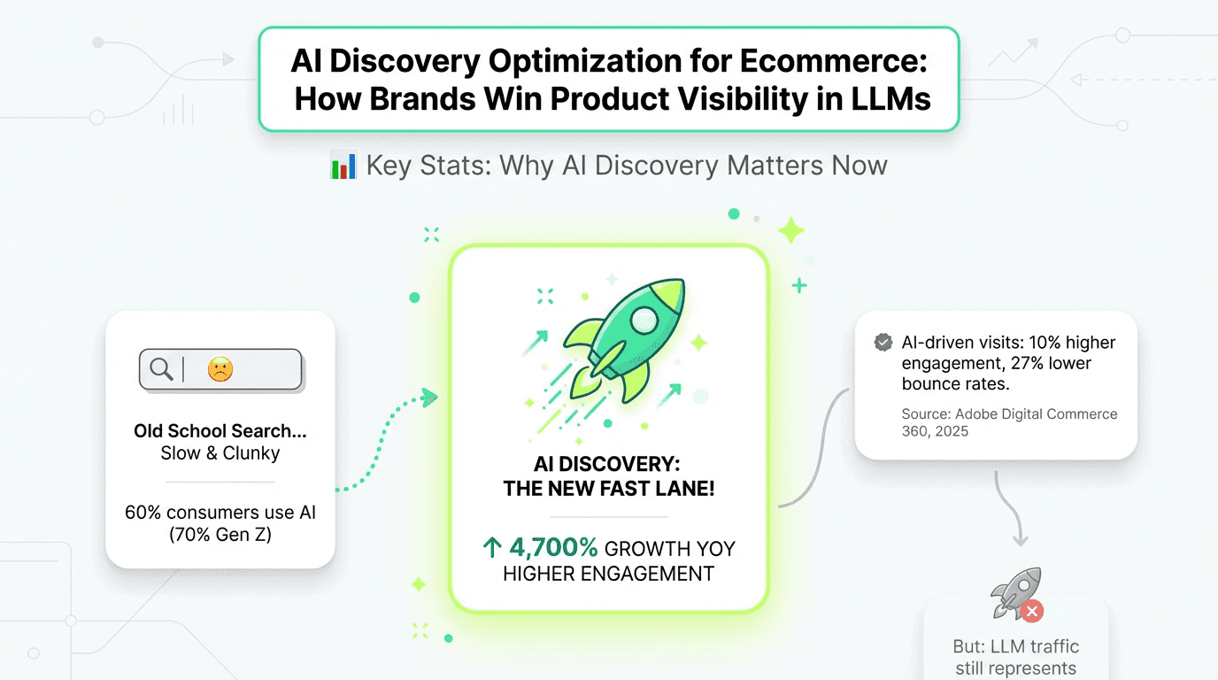 60% of customers now use AI assistants to research products online, jumping to 70% among Gen Z. AI-driven ecommerce traffic surged 4,700% year-over-year through July 2025, with visitors showing 10% higher engagement than traditional traffic. But here's the paradox: a study tracking 973 ecommerce websites found LLM-referred traffic still represents less than 0.2% of total volume.