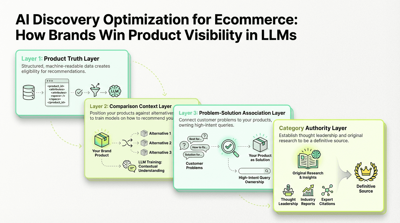 AI discovery optimization for ecommerce is the practice of increasing how often your products and brand are mentioned or recommended in LLM-generated answers (e.g., ChatGPT, Perplexity, Gemini). It's less about ranking #1 for a keyword and more about earning consistent citations across many shopping contexts. In practice, it combines product data quality, comparison content, problem-solution content, and category authority.