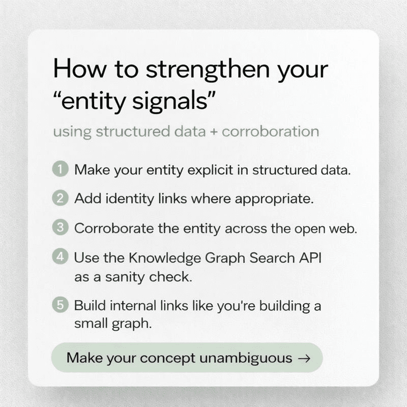 To build an entity for SEO, publish authoritative content that clearly defines the entity, use schema markup to help search engines recognize it, link to relevant external sources, and ensure consistent references across the web (including Wikipedia, Wikidata, and profiles).