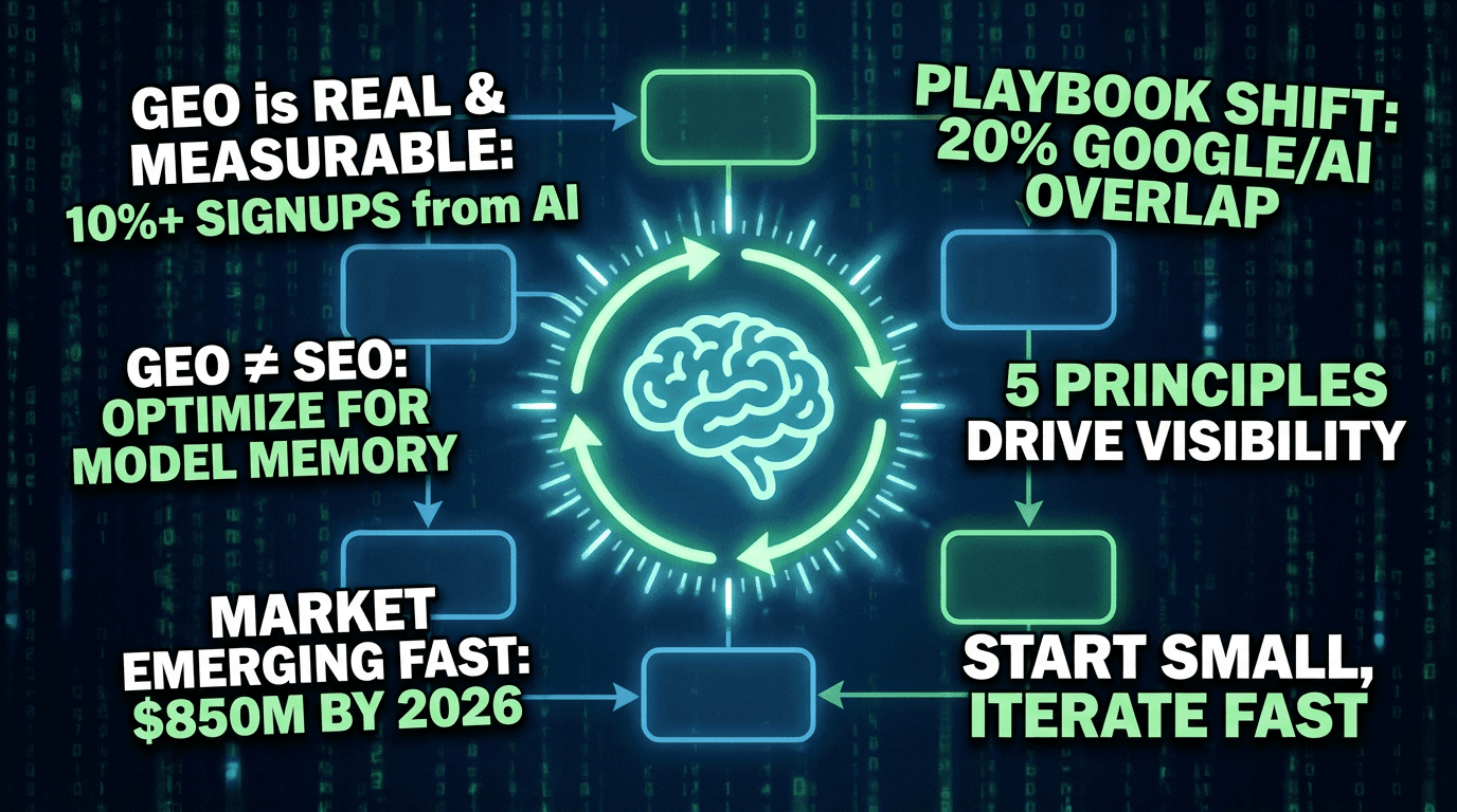 After working with growth teams navigating this shift, I've observed five geo strategies that separate those gaining AI visibility from those getting ignored: