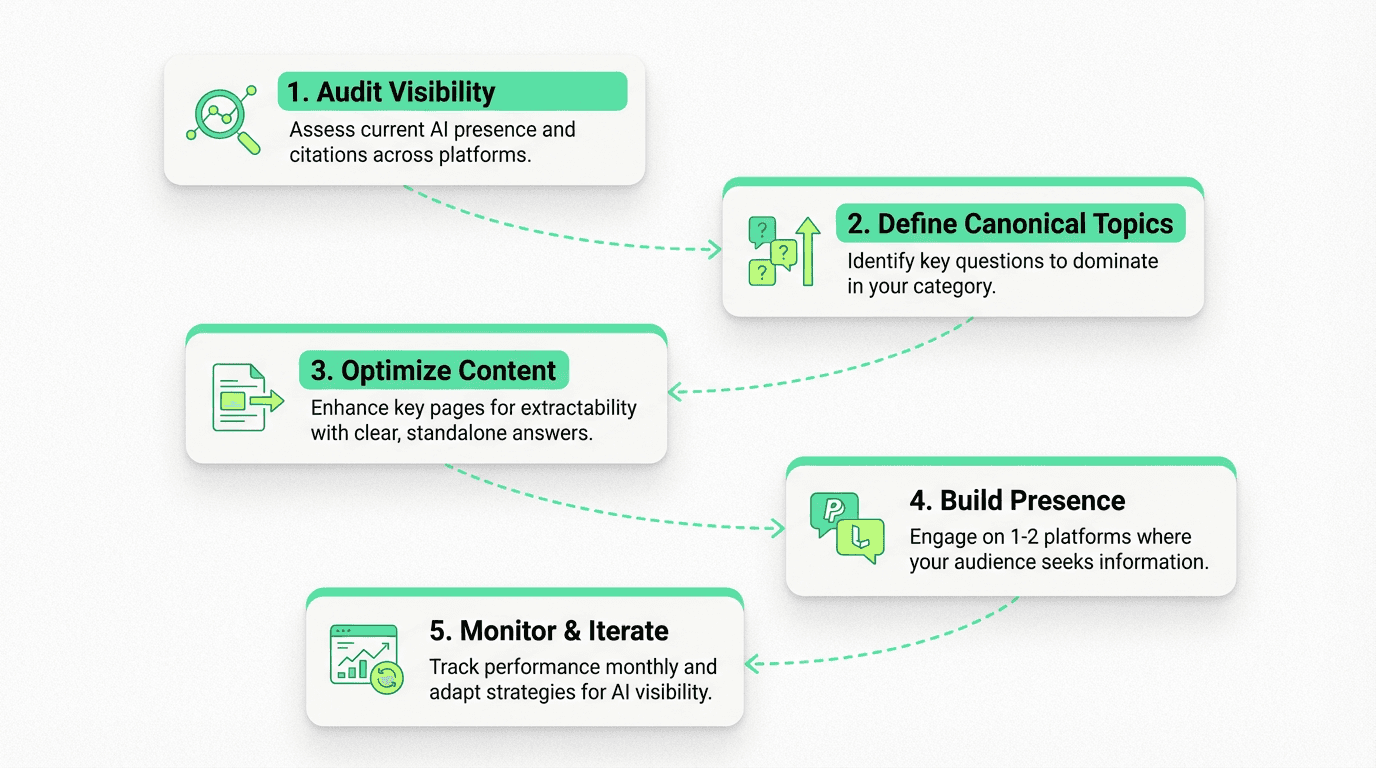 Start small, iterate fast: Audit visibility, optimize 3-5 key pages, build presence where your audience asks questions, monitor monthly