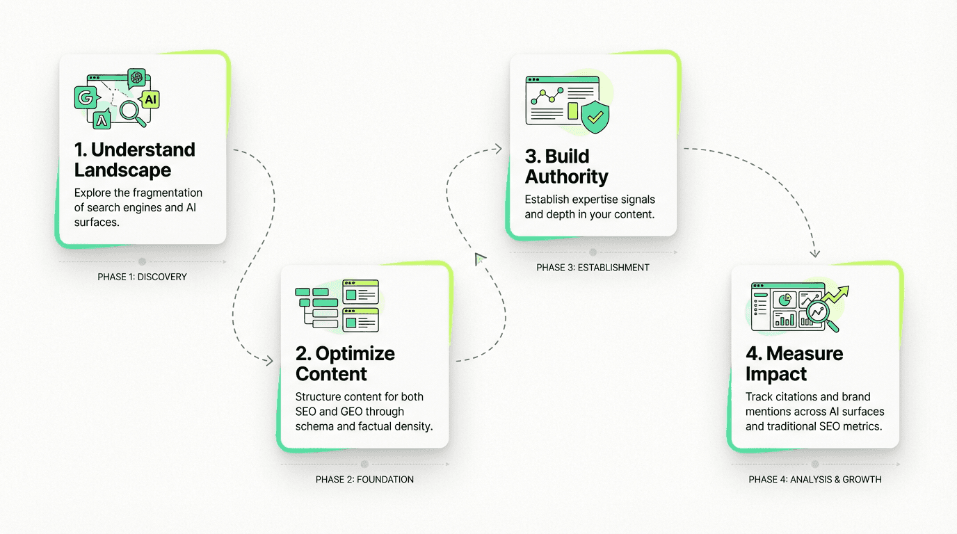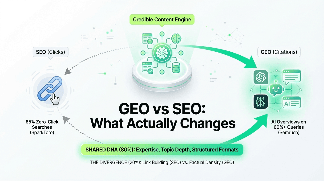 If you're building credible content with strong expertise signals and clear entity definitions, you're 80% of the way to winning both SEO and GEO. The last 20% is surface-specific optimization.