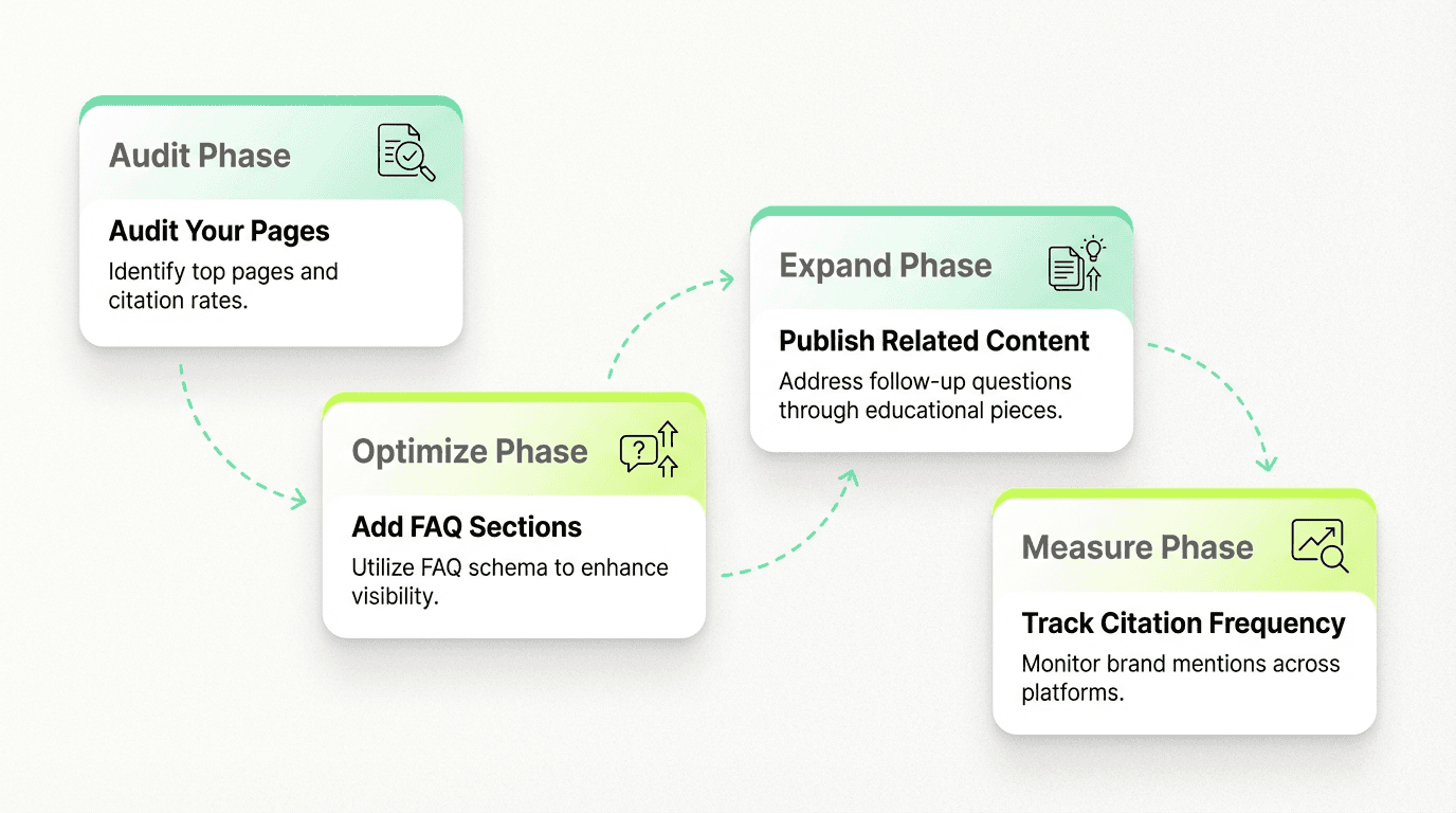 Week 1: audit your top impression pages and manually check whether they're cited in major answer engines for your core queries. Week 2: add a tight FAQ section, restructure key sections into standalone chunks, and add verifiable proof points (data, quotes, references). Weeks 3–4: publish follow-up Q&A content for high-intent questions and build off-site authority via expert contributions and credible mentions, then measure citation changes over 30/60/90 days (a workflow you can systematize in Metaflow once it's working).