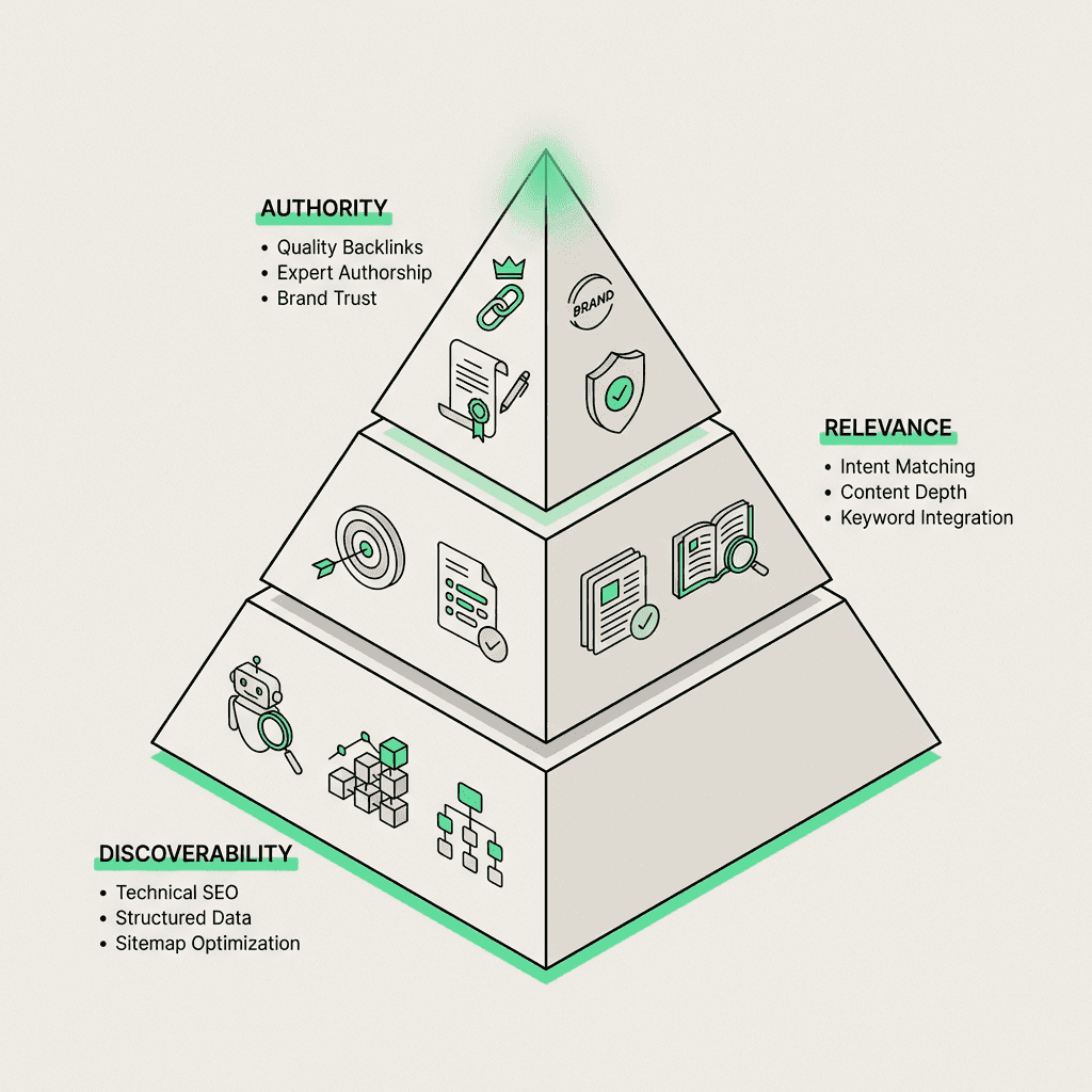 Relevance Layer: Does your material match the user intent and sub-queries? (Topical coverage, entity optimization, semantic clarity)