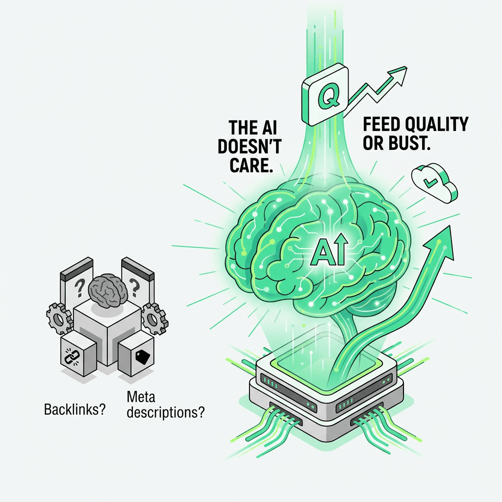 SEO mindset fails because you can't "build backlinks" to a product feed. The AI doesn't evaluate domain authority; it evaluates data completeness, accuracy, and information quality.