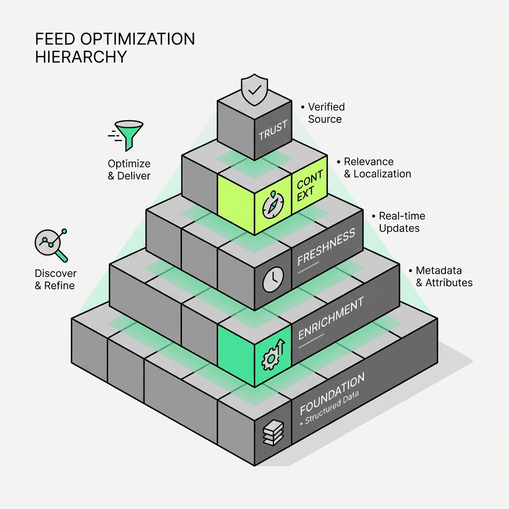 For enterprise merchants: You likely have the technical resources to integrate feeds via API and maintain real-time sync across inventory systems. Your advantage is scale; thousands of SKUs with rich attribute data and comprehensive product catalogs. Your challenge is organizational: getting product teams, engineering, and marketing aligned on feed quality as a strategic priority for optimization.