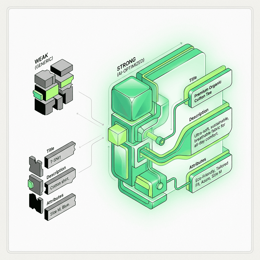 Amazon optimization fails because while reviews matter, feed structure and metadata richness matter more. The AI needs machine-readable attributes, not persuasive bullet points or marketing content.