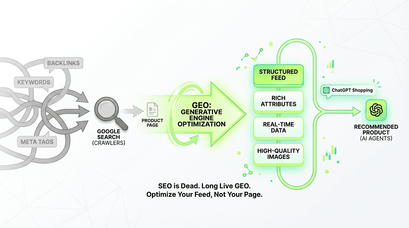 This isn't another marketing channel; it's a fundamental shift from SEO to GEO (Generative Engine Optimization). Rankings are dynamic and conversational; product feeds are the primary ranking signal, not backlinks or content.