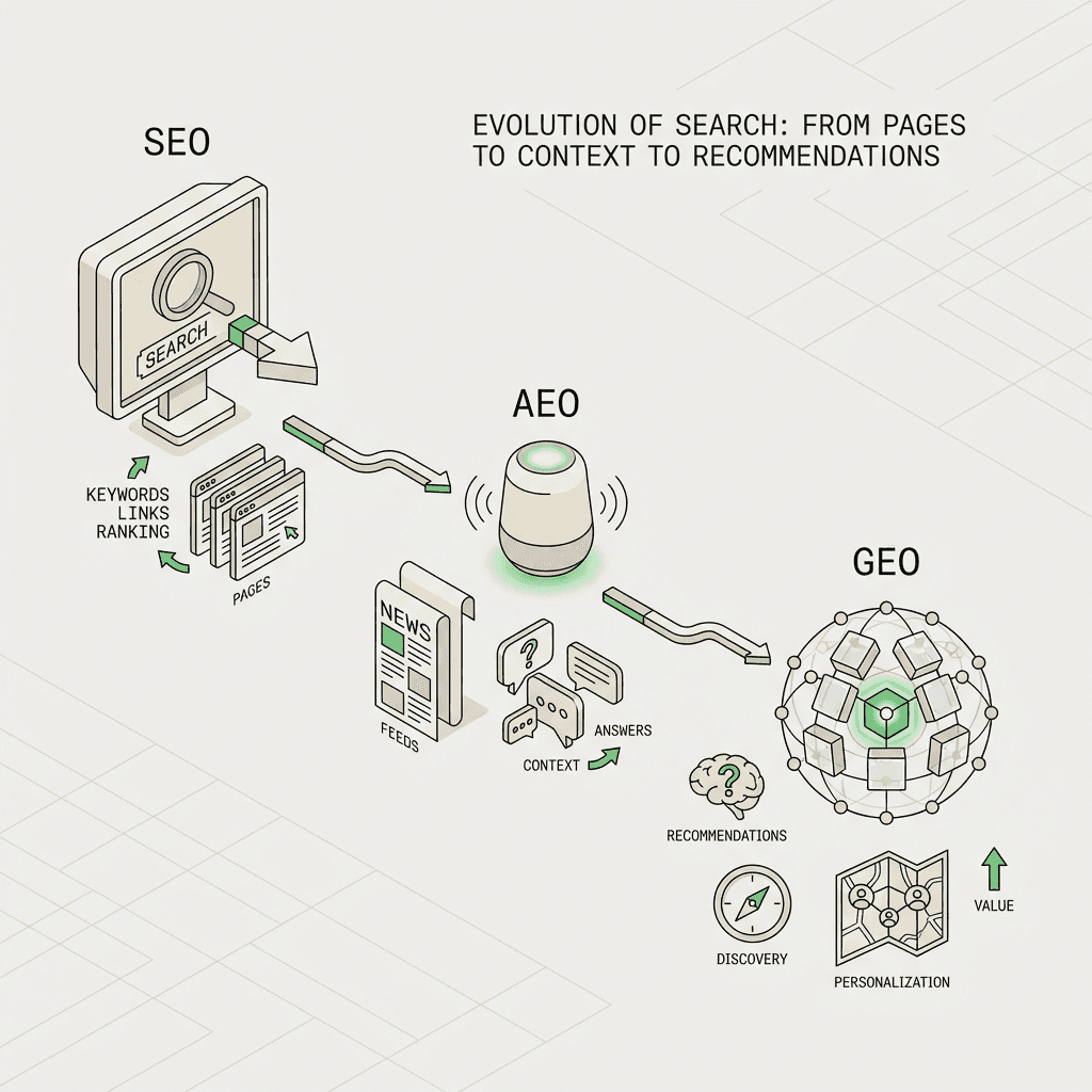 GEO (2020s+): Generative Engine Optimization → AI synthesizes answers, recommends products, completes tasks → AI owns the answer, you own the transaction and customer relationship