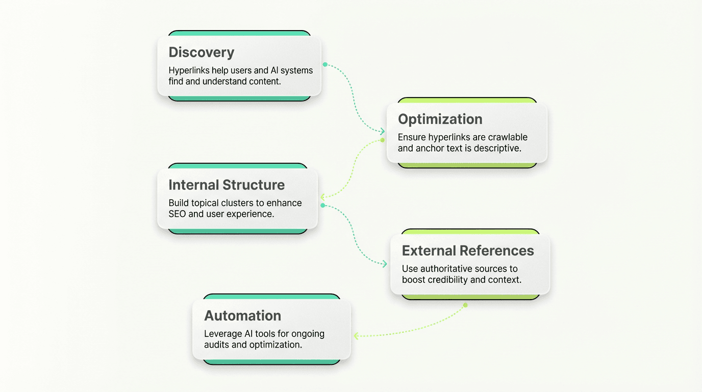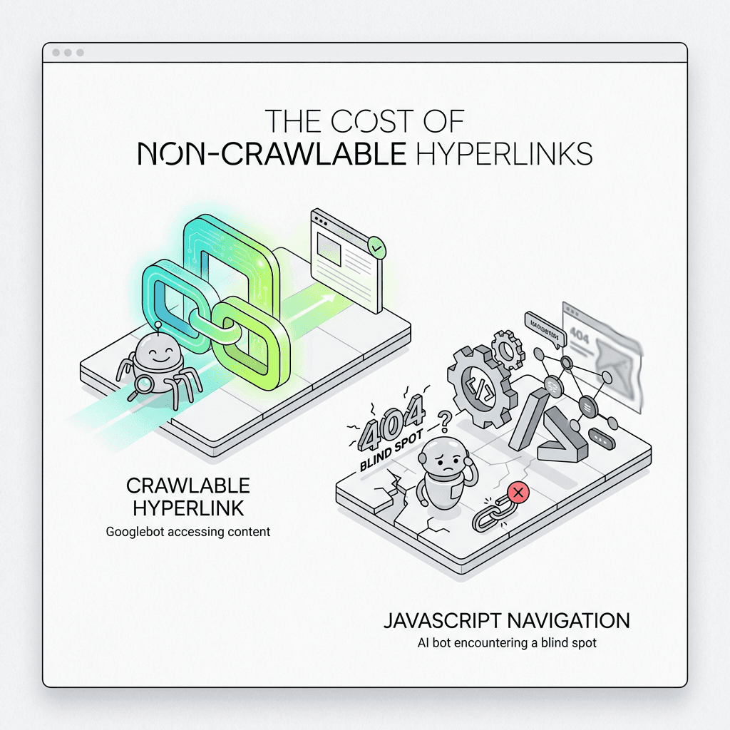 Hyperlinks drive discovery, relevance, and AI citations: Search engines and LLMs use connections to crawl, understand context, and generate answers. Non-crawlable patterns reduce visibility and organic traffic.