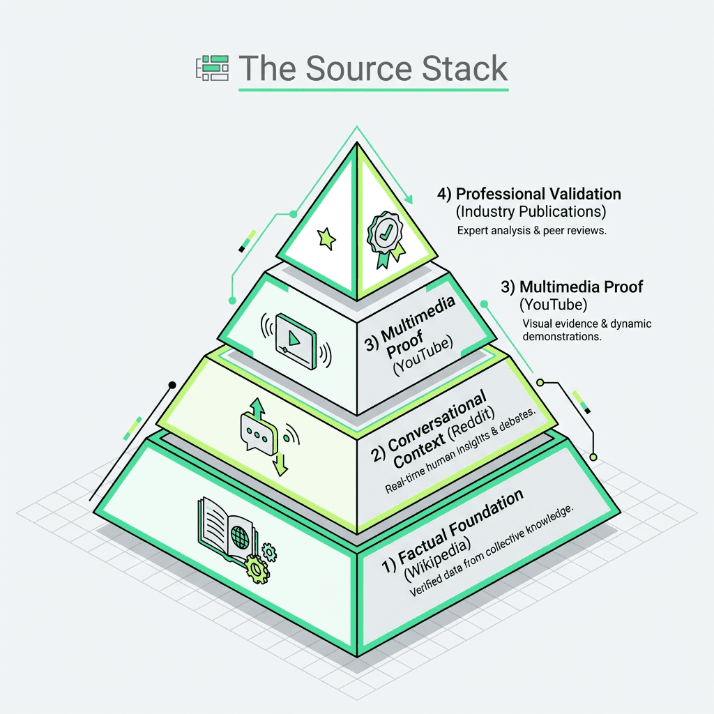 The Source Stack is a four-layer model describing how these systems triangulate truth: factual foundation (Wikipedia), conversational context (Reddit), multimedia proof (YouTube), and professional validation (industry publications).