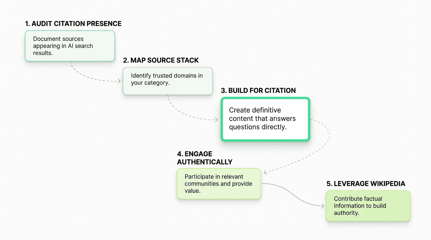 Start by mapping which sources already appear in your category's Source Stack, then publish a definitive resource that out-answers those sources for a specific intent (comparisons, implementation, pricing logic, pitfalls). Metaflow frames this as "citation architecture": build assets designed to be referenced, not just to rank and convert.
