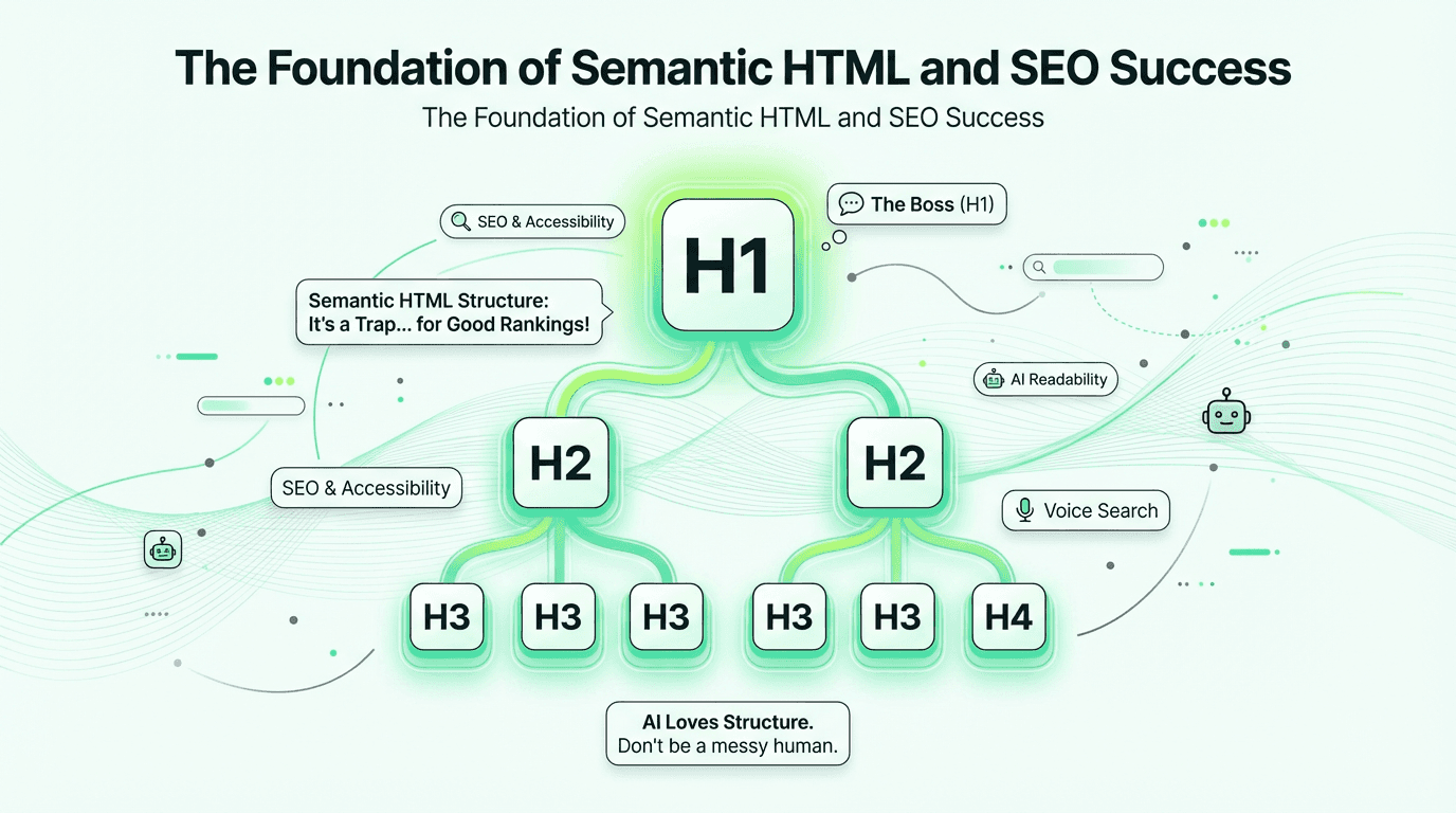 When you land on a web page, what's the first thing that tells you what the site is about? Nine times out of ten, it's the big, bold headline at the top—your main heading. But this isn't just a design choice. The H1 header is a critical piece of semantic HTML that signals to both users and search engines what your content is all about. In an era where Google, ChatGPT, and AI Overviews are parsing your pages to extract structured answers, getting your heading hierarchy right isn't optional—it's foundational.