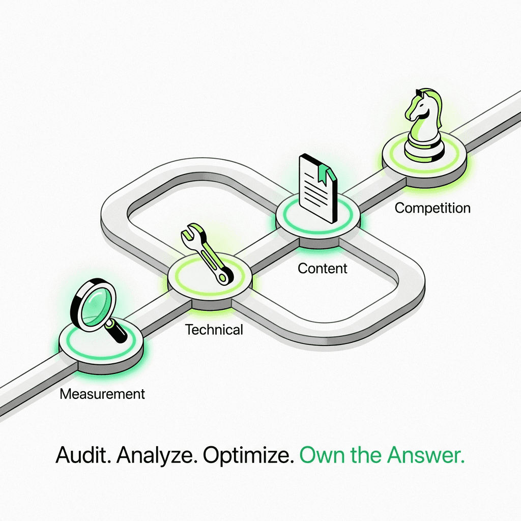 The strategic shift: From traffic acquisition to answer ownership. The new moat is co-citation intelligence. Start with a 30-day audit: baseline measurement, technical review, content analysis, competitive intelligence.