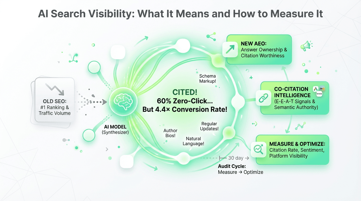 AI search visibility measures how often your brand is cited in AI-generated answers, not where you rank. In practice, it's the foundation for tracking brand visibility ai search. The shift is categorical: 60% of searches on AI search engines end without a click, but traffic from AI-powered search converts at 4.4× the rate of traditional search. Traditional SEO metrics (rankings, traffic, backlinks) are increasingly uncorrelated with citations in generative AI responses.