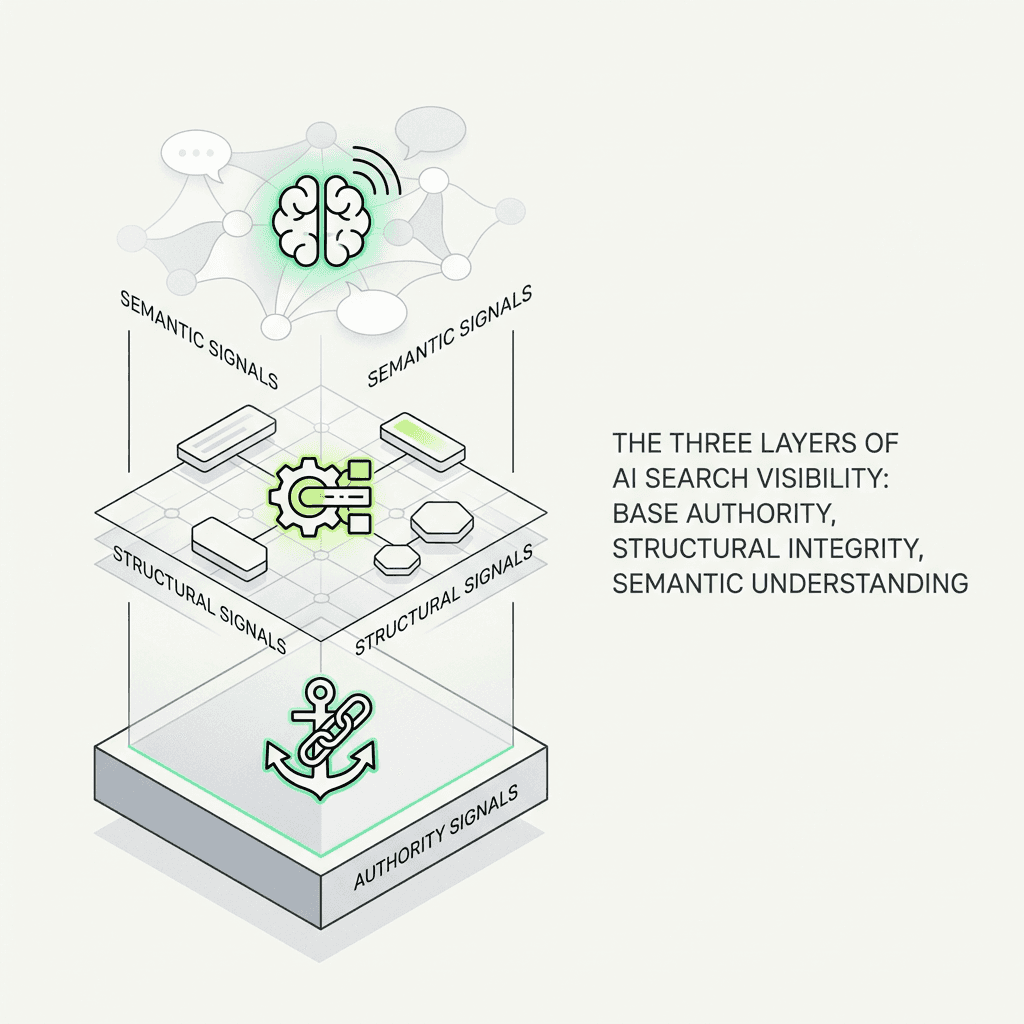 AI models evaluate content across three distinct layers. Understanding this architecture is the difference between random citations and systematic visibility.