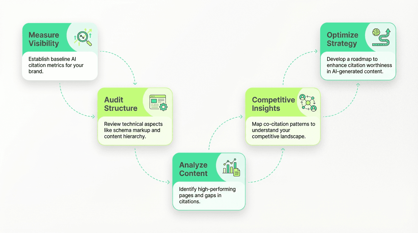 Week 1: baseline citations across 10-20 core queries; Week 2: technical review (schema, headings, indexing/crawlers); Week 3: content analysis (which pages get cited and why); Week 4: competitive intelligence via co-citation patterns. The outcome should be a prioritized roadmap tied to citation lift, not just traffic growth, Metaflow's approach emphasizes this "answer ownership" baseline-first workflow.