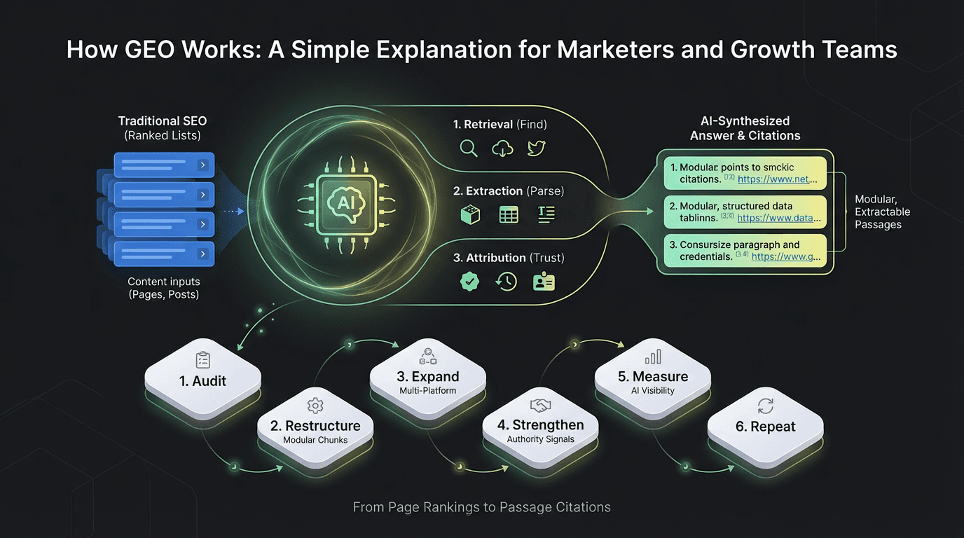 Generative Engine Optimization (GEO) is the practice of structuring content so AI systems like ChatGPT, Perplexity, and Google AI Overviews can retrieve it, extract it accurately, and cite it in synthesized answers. Instead of optimizing only for page rankings, GEO optimizes for passage-level citability—short, self-contained segments that work when pulled out of context.