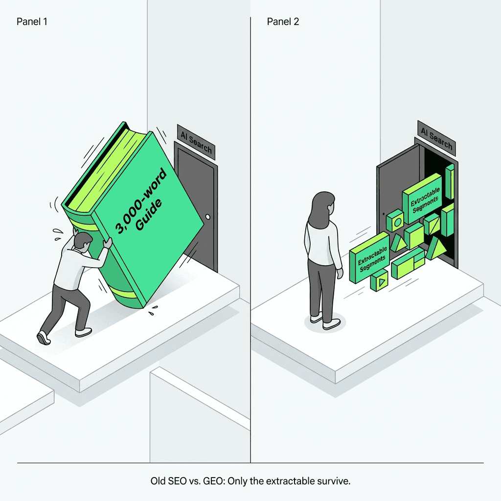 Structural shift required: Traditional SEO optimized for page-level ranking. GEO requires passage-level extractability—self-contained, modular sections that work independently in AI search results.